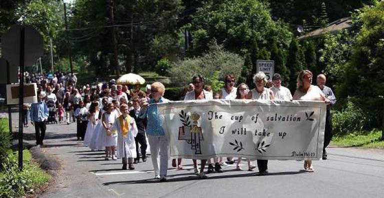 On Sunday, June 22, Holy Rosary Parish in Greenwood Lake celebrated the Feast of Corpus Christi with a procession to the Thomas P. Morahan Waterfront Park on Greenwood Lake where Benediction was offered. The feast celebrates the belief in Jesus Christ and the sacrament of Holy Eucharist. The procession route was escorted by the 4th Degree Color Corps from the John Cardinal O'Connor Knights of Columbus from Monroe and the parish's altar servers. The Communion children and flower girls led the way by tossing rose petals along the path. The procession was followed by a celebratory lunch and Eucharistic craft activities were provided for the children.