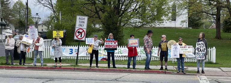 Fourteen people gathered in the rain on Main Street last Saturday, April 26, to protest President Trump’s administration. Here’s a sampling of the messages that were offered.